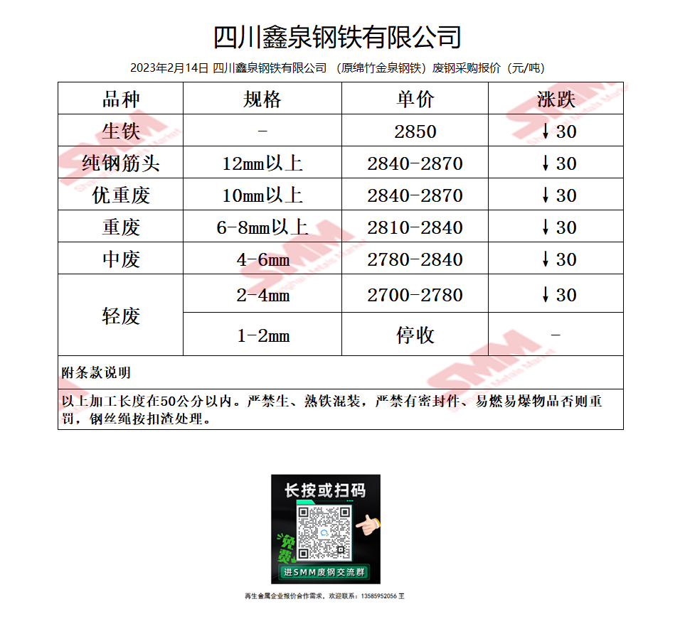 2月14日鑫泉钢铁(原绵竹金泉钢铁) 废钢采购报价