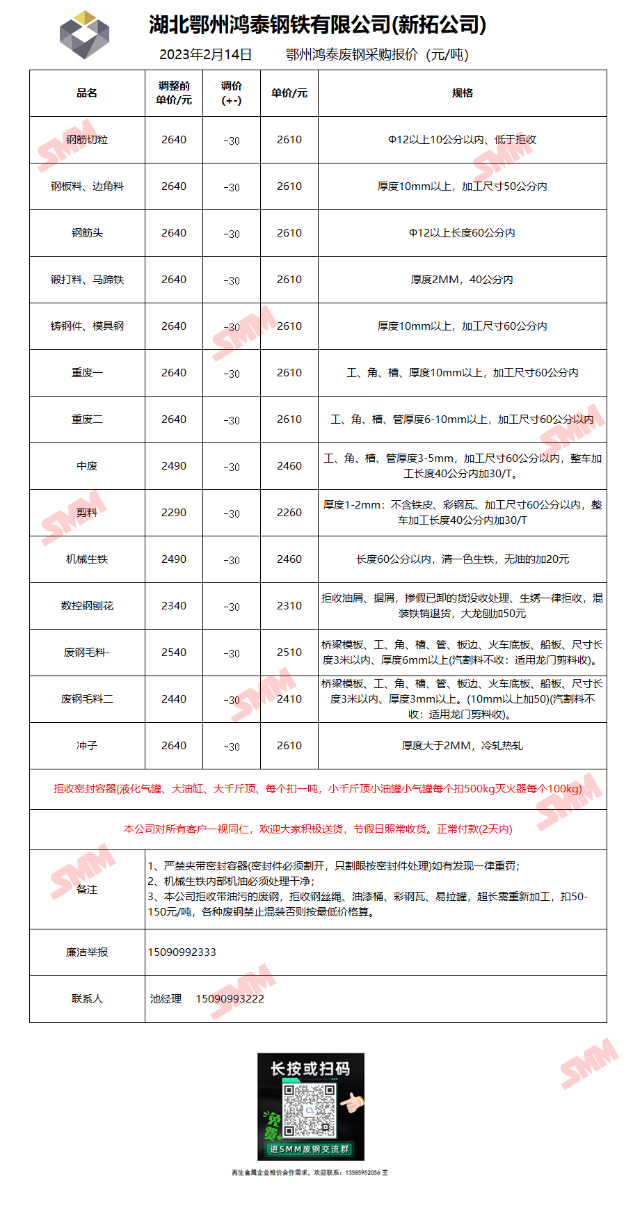 2月14日湖北鄂州鸿泰 废钢采购报价