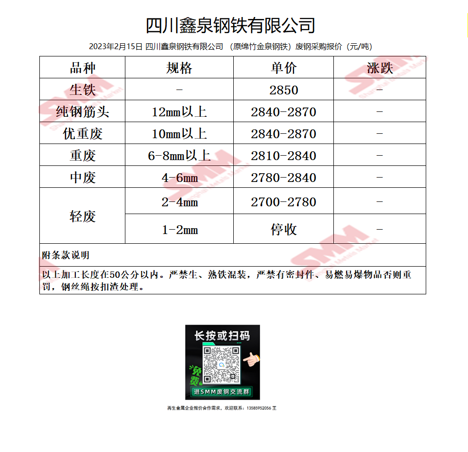2月15日鑫泉钢铁(原绵竹金泉钢铁) 废钢采购报价