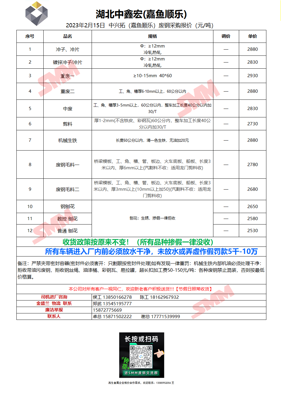 2月15日湖北中鑫宏(嘉鱼顺乐) 废钢采购报价