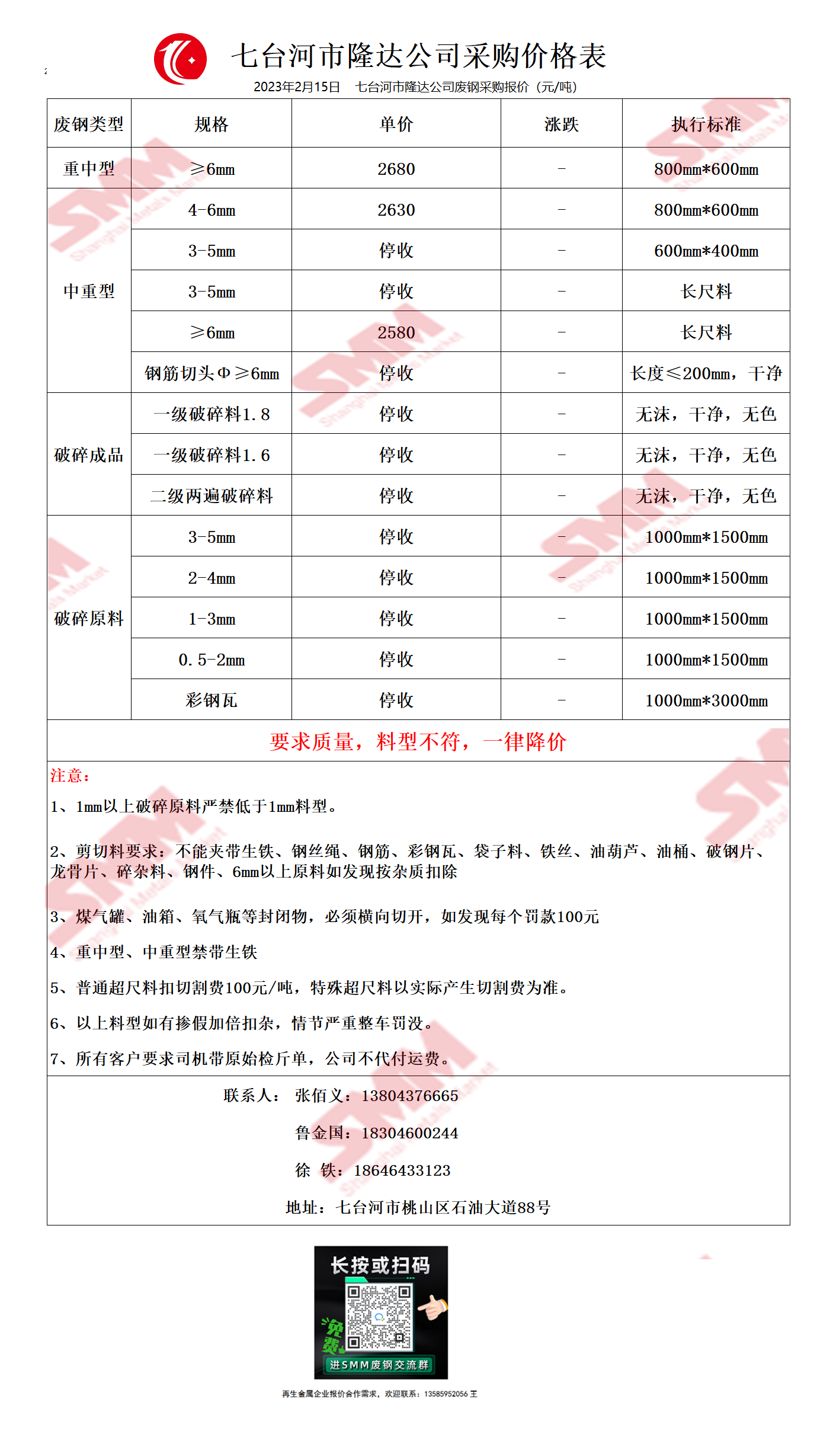 今日七台河市隆达 废钢采购报价已更新,有货的朋友欢迎联系我们!
