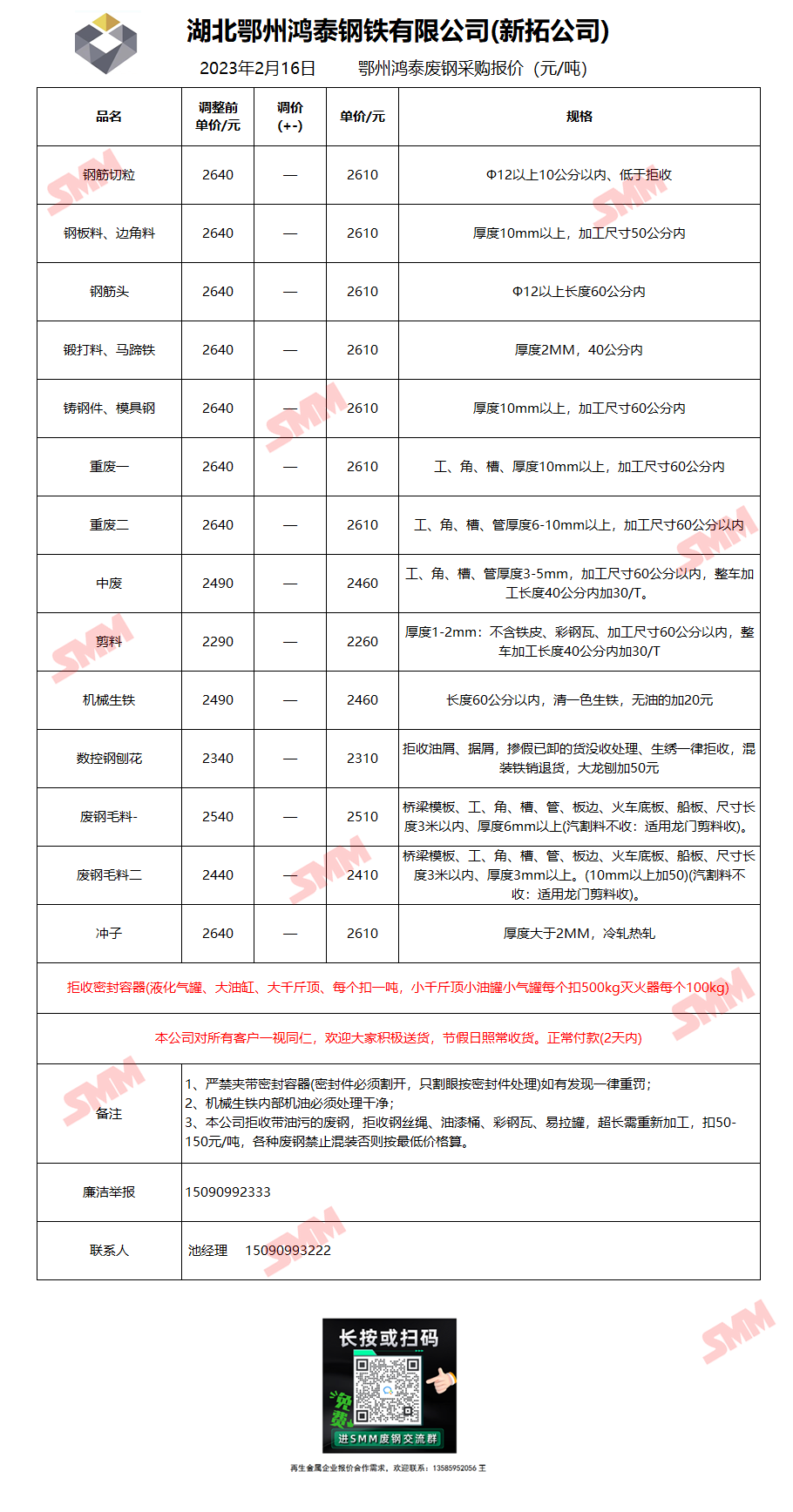 2月16日湖北鄂州鸿泰 废钢采购报价