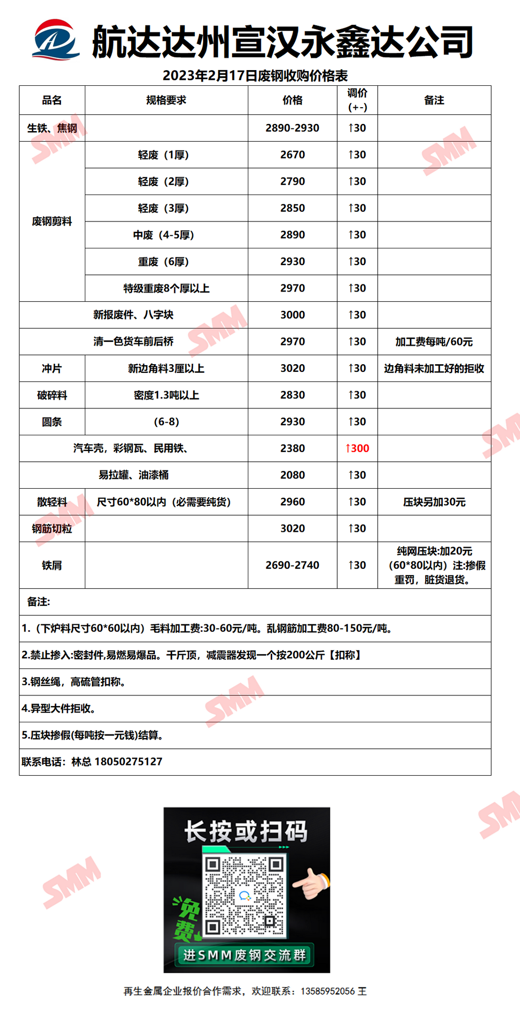 今日达州宣汉永鑫达 废钢收购报价已更新,有货的朋友欢迎联系我们!