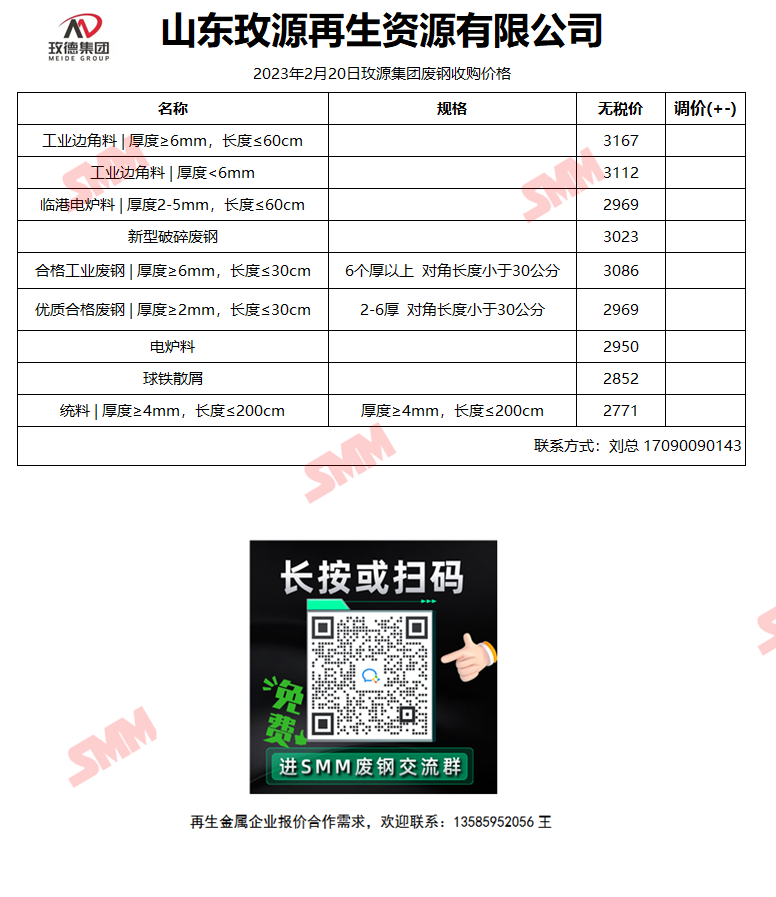 2月20日山东玫源再生 废钢收购报价