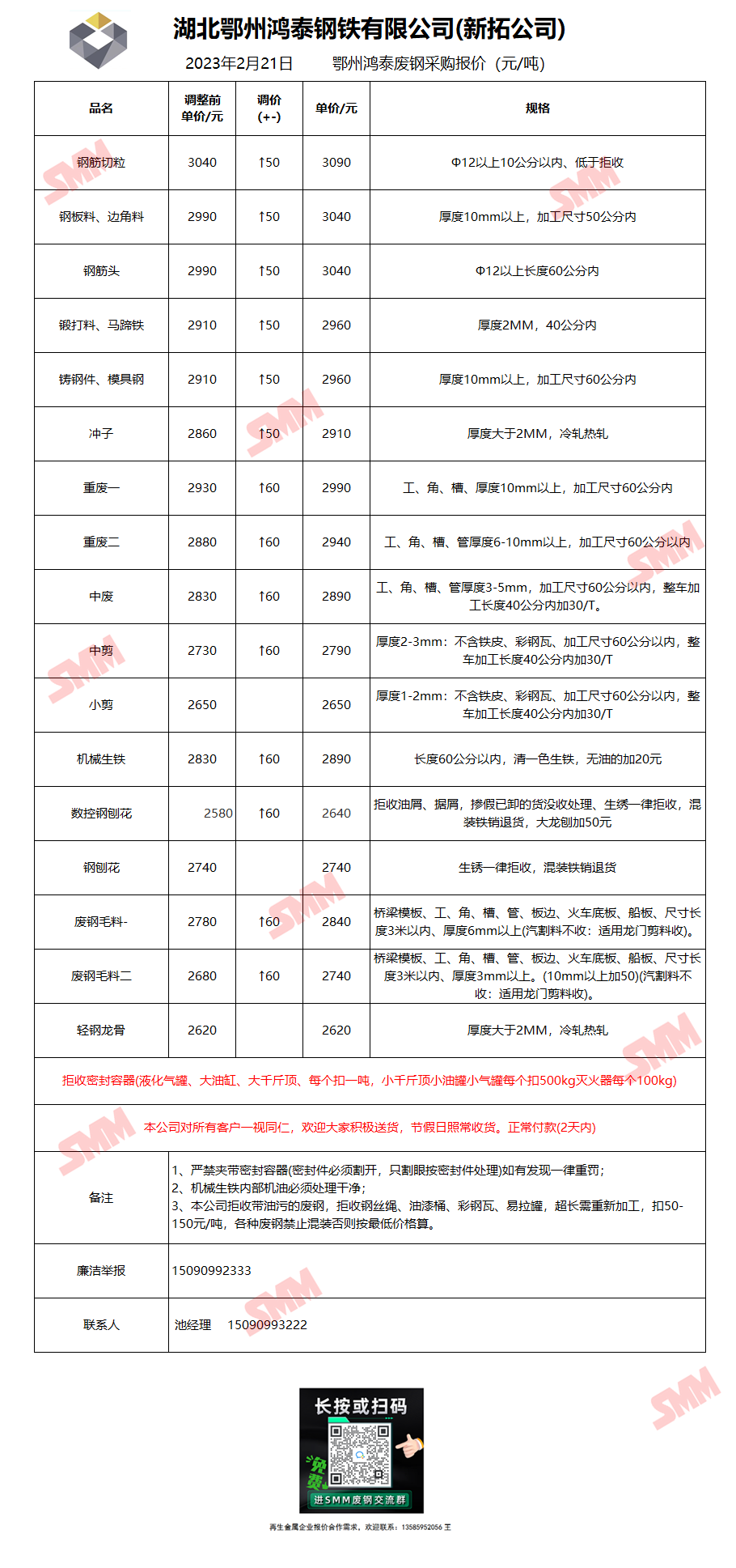 2月21日湖北鄂州鸿泰 废钢采购报价