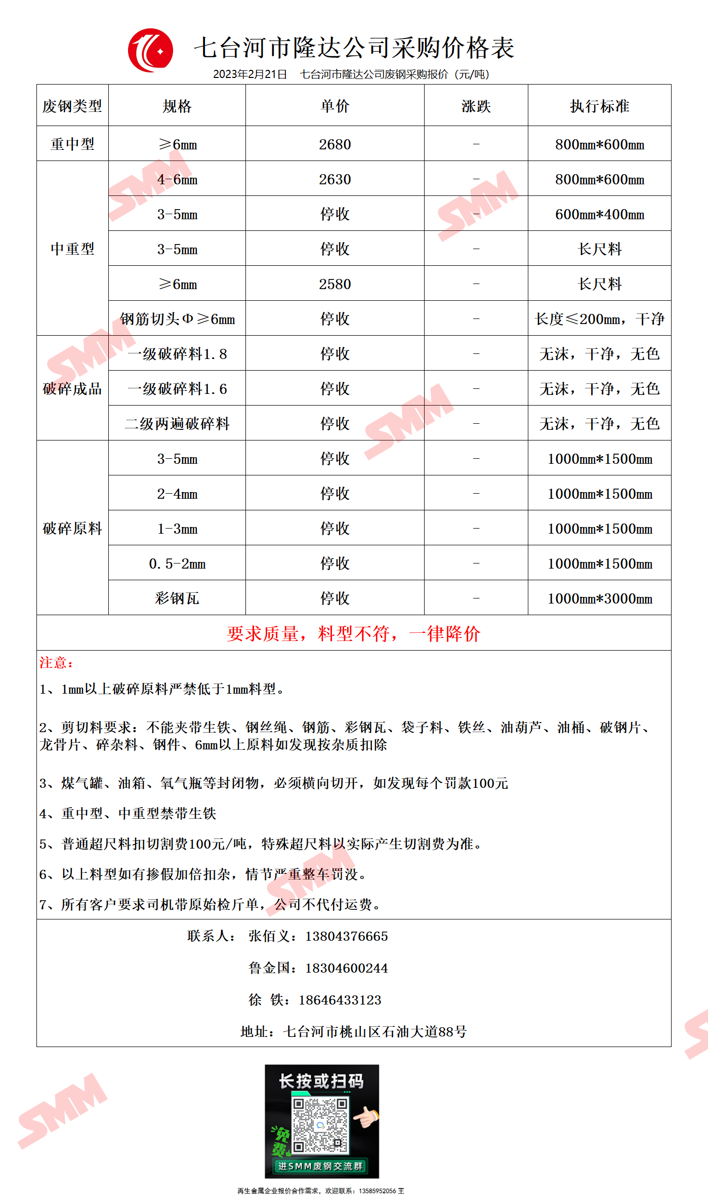 今日七台河市隆达 废钢采购报价已更新,有货的朋友欢迎联系我们!