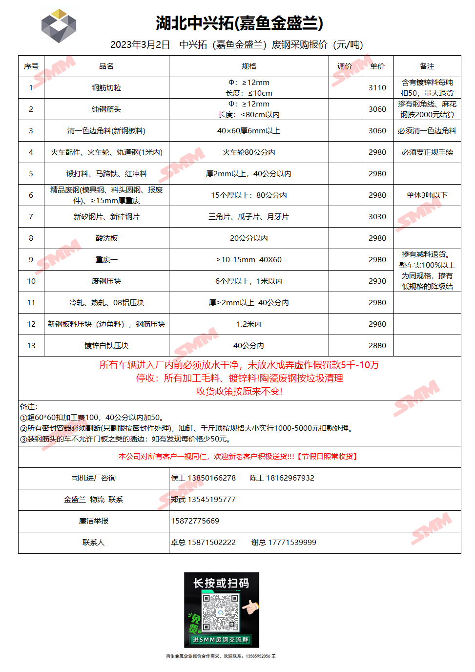 3月2日湖北中兴拓(嘉鱼金盛兰) 废钢采购报价