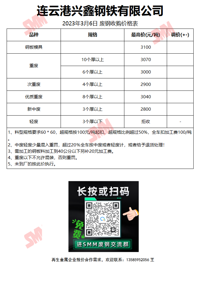 3月6日连云港兴鑫钢铁 废钢收购报价