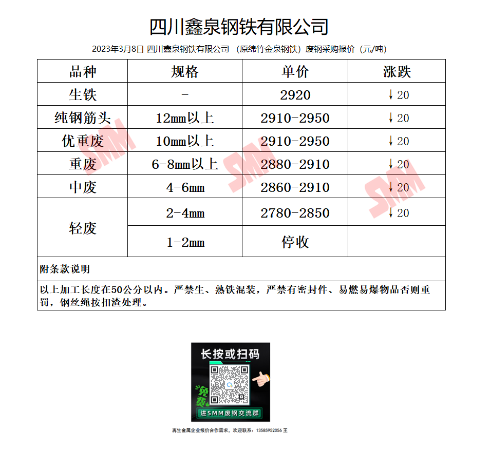 3月8日鑫泉钢铁(原绵竹金泉钢铁) 废钢采购报价