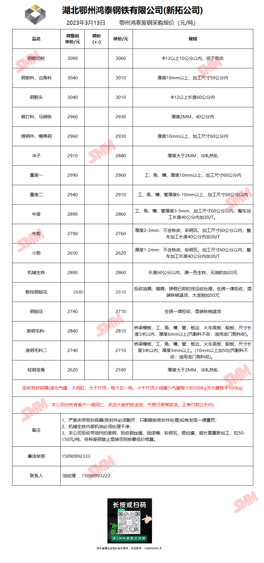 3月13日湖北鄂州鸿泰 废钢采购报价