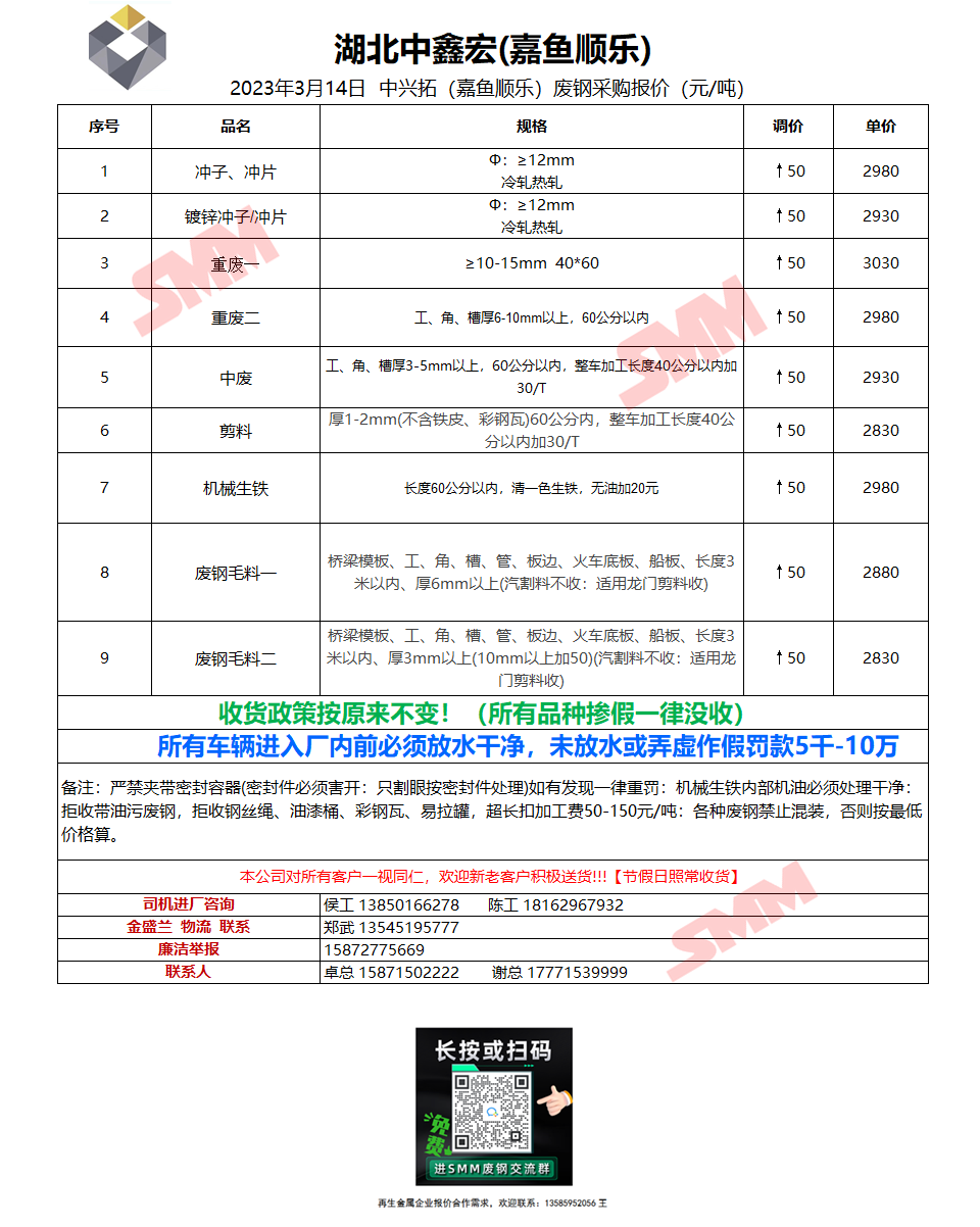 3月14日湖北中鑫宏(嘉鱼顺乐) 废钢采购报价