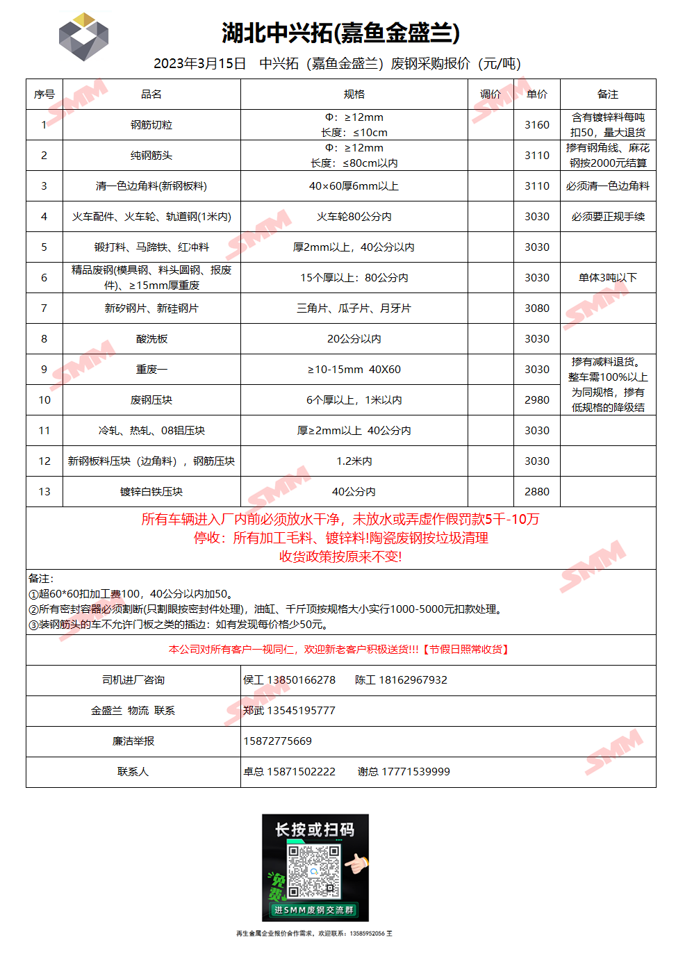 3月15日湖北中兴拓(嘉鱼金盛兰) 废钢采购报价