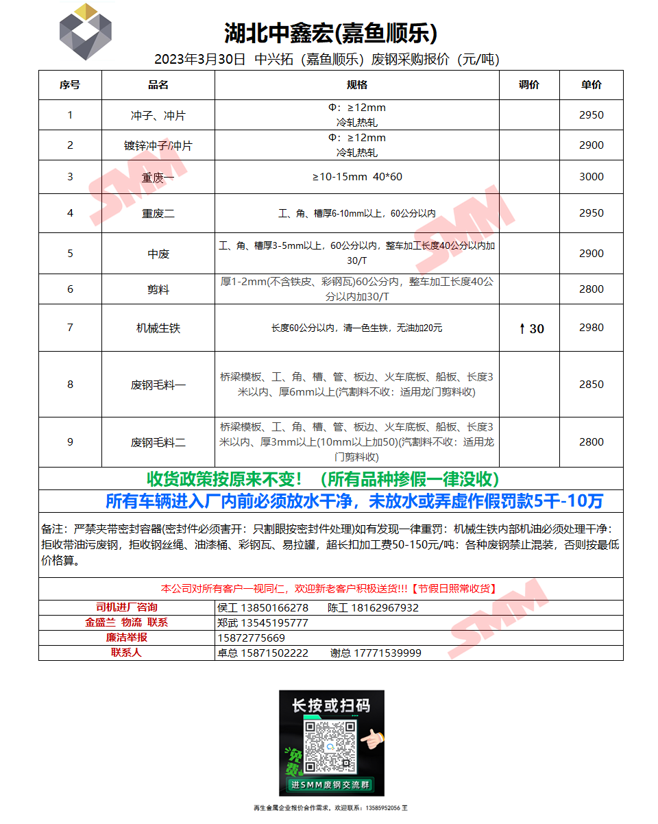 3月30日湖北中鑫宏(嘉鱼顺乐) 废钢采购报价