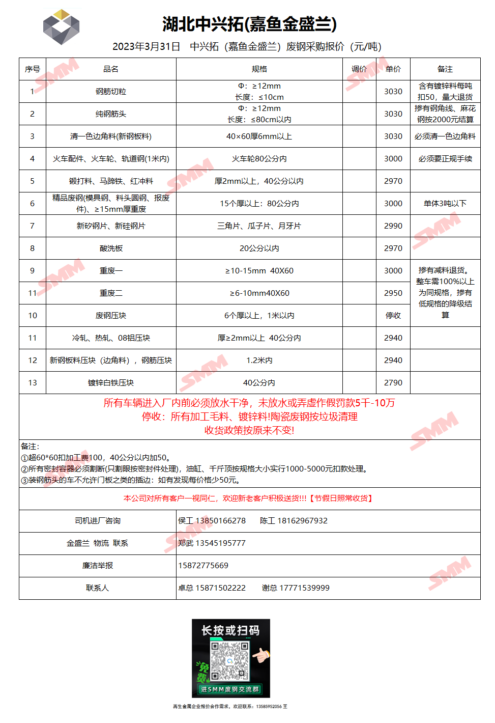 3月31日湖北中兴拓(嘉鱼金盛兰) 废钢采购报价