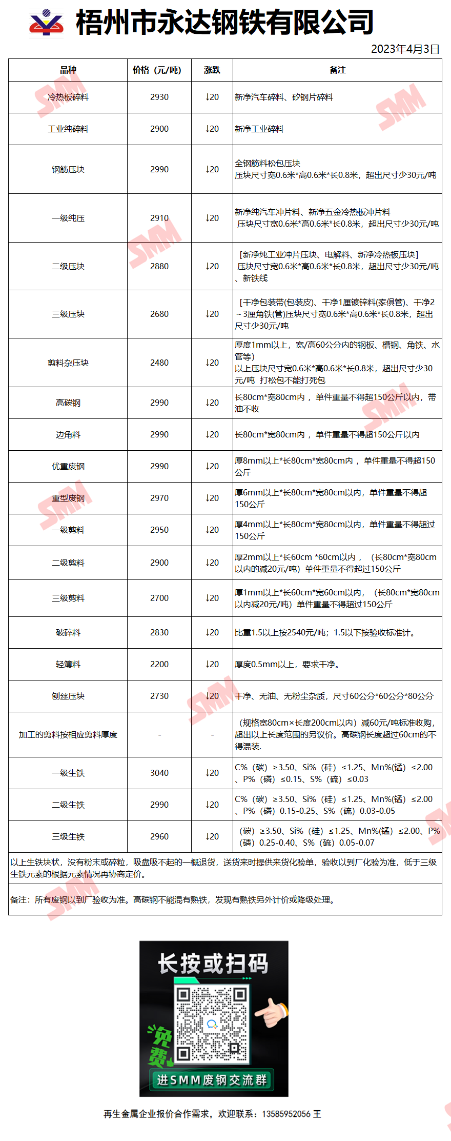 4月3日(14时07分)梧州永达钢铁 废钢收购报价