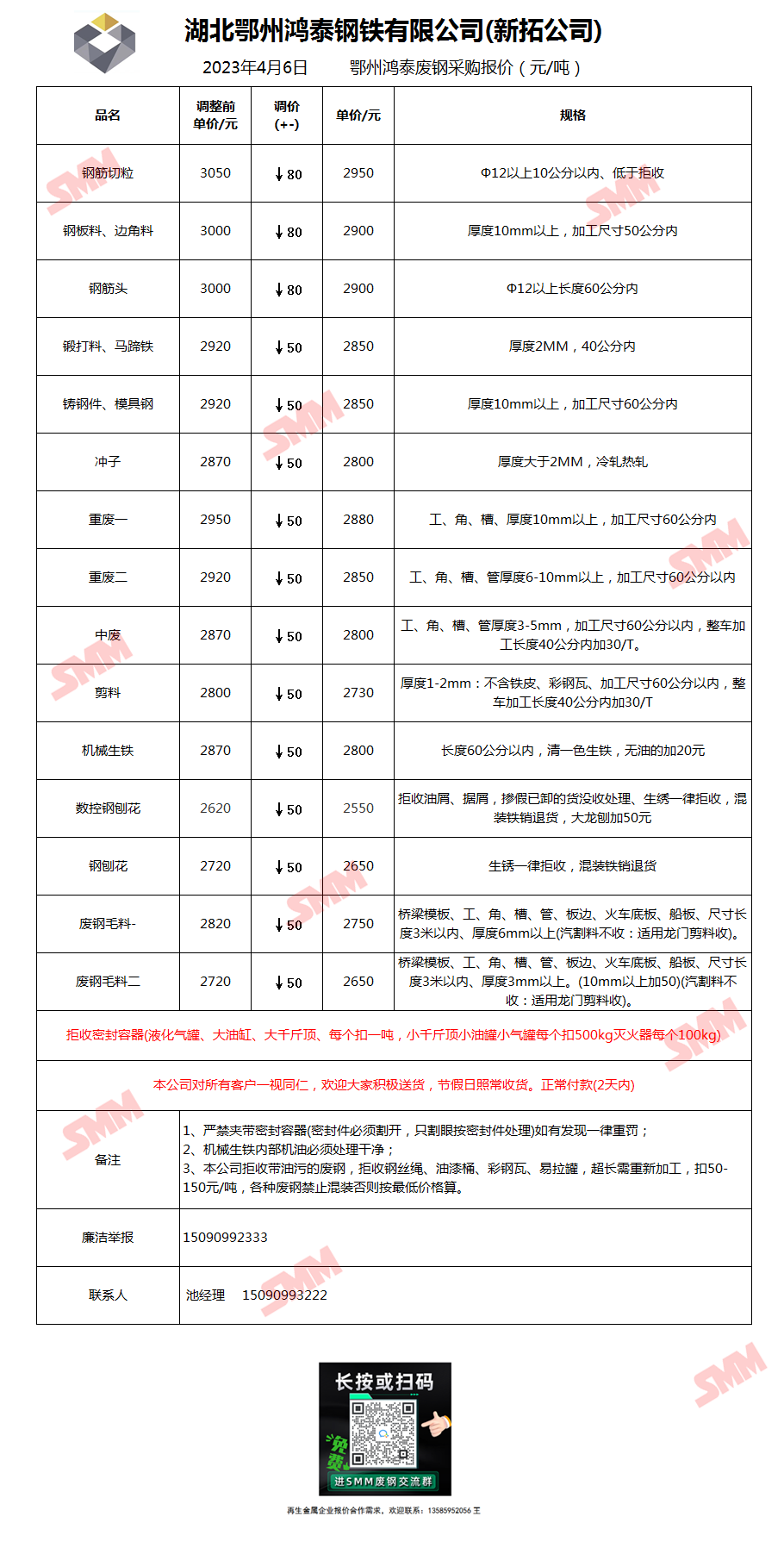4月6日湖北鄂州鸿泰 废钢采购报价