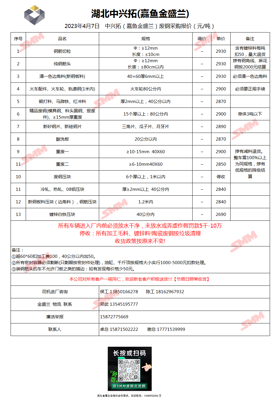 4月7日湖北中兴拓(嘉鱼金盛兰) 废钢采购报价