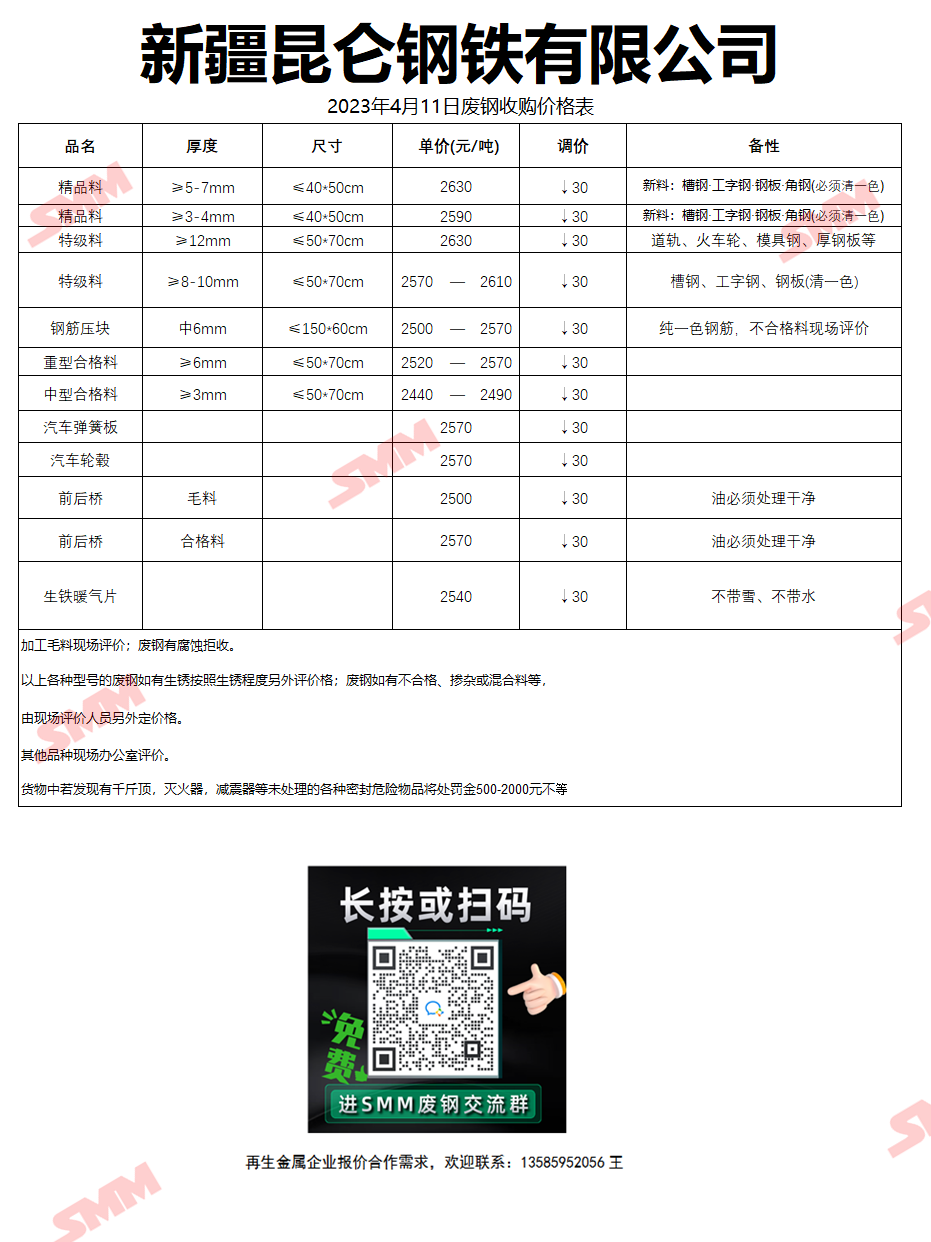 4月11日新疆昆仑钢铁 废钢收购报价
