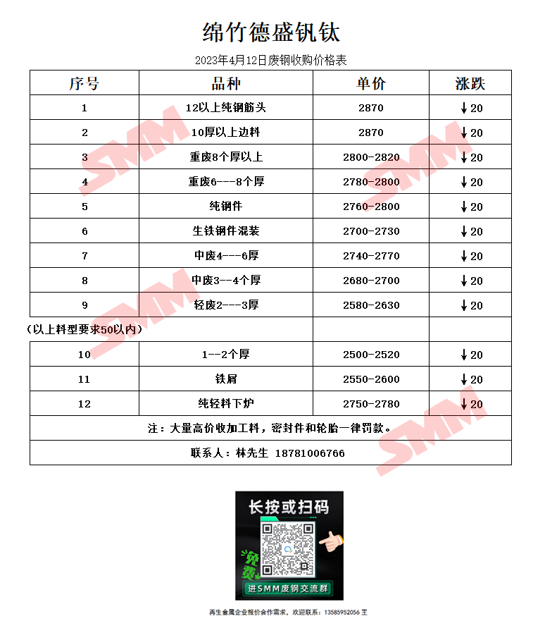 4月12日绵竹德盛钒钛 废钢收购报价