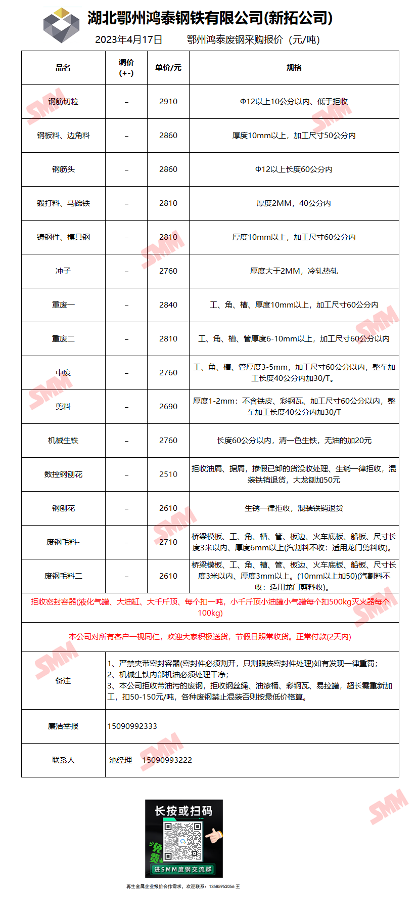 4月17日湖北鄂州鸿泰 废钢采购报价