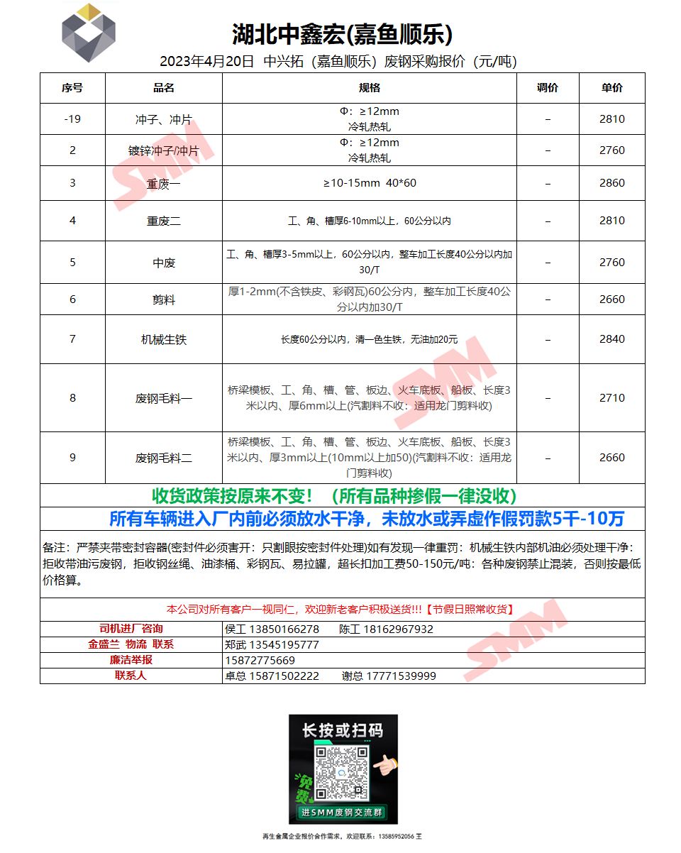 4月20日湖北中鑫宏(嘉鱼顺乐) 废钢采购报价