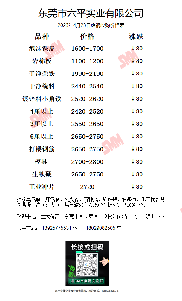 4月23日六平实业 废钢收购报价