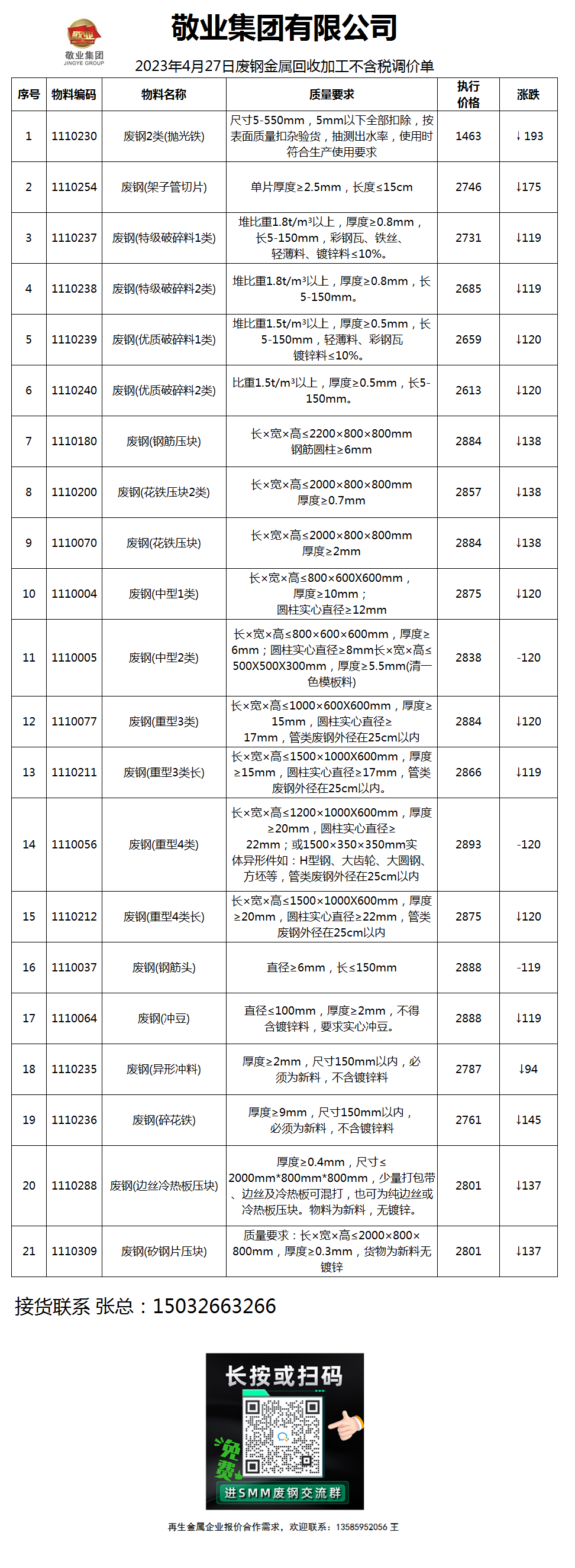今日敬业钢铁本部 废钢采购报价已更新,有货的朋友欢迎联系我们!