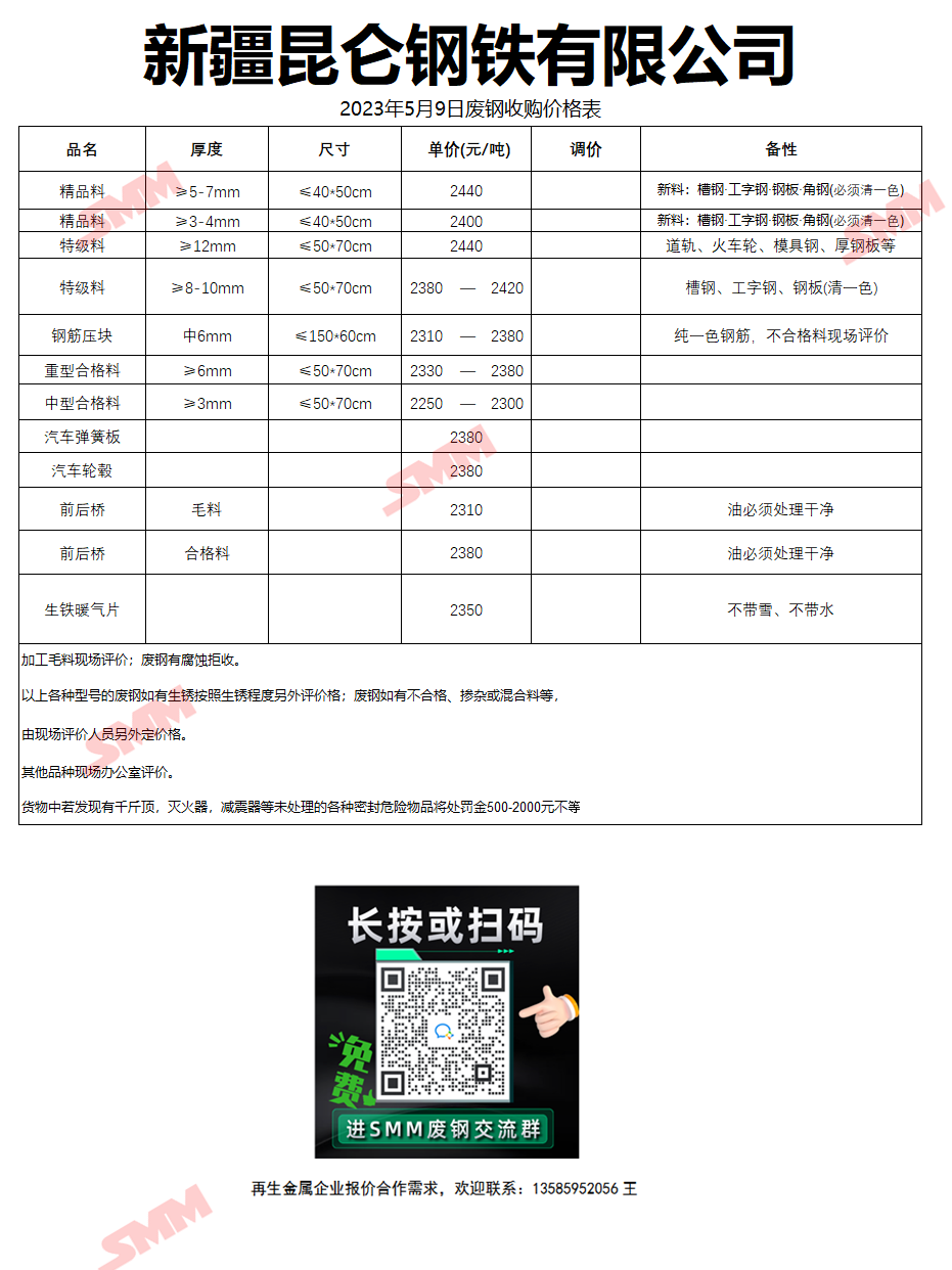 5月9日新疆昆仑钢铁 废钢收购报价