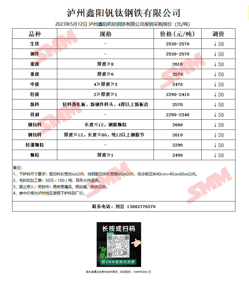 5月12日泸州鑫阳钒钛 废钢采购报价