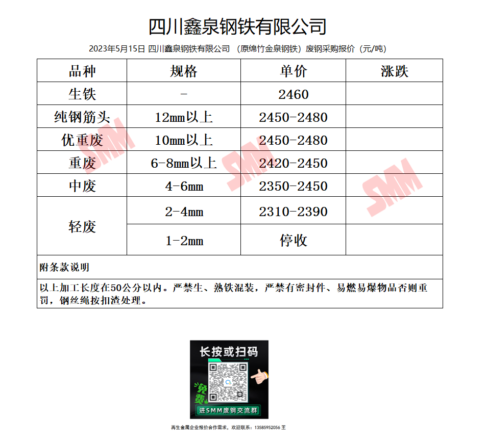 5月15日鑫泉钢铁(原绵竹金泉钢铁) 废钢采购报价