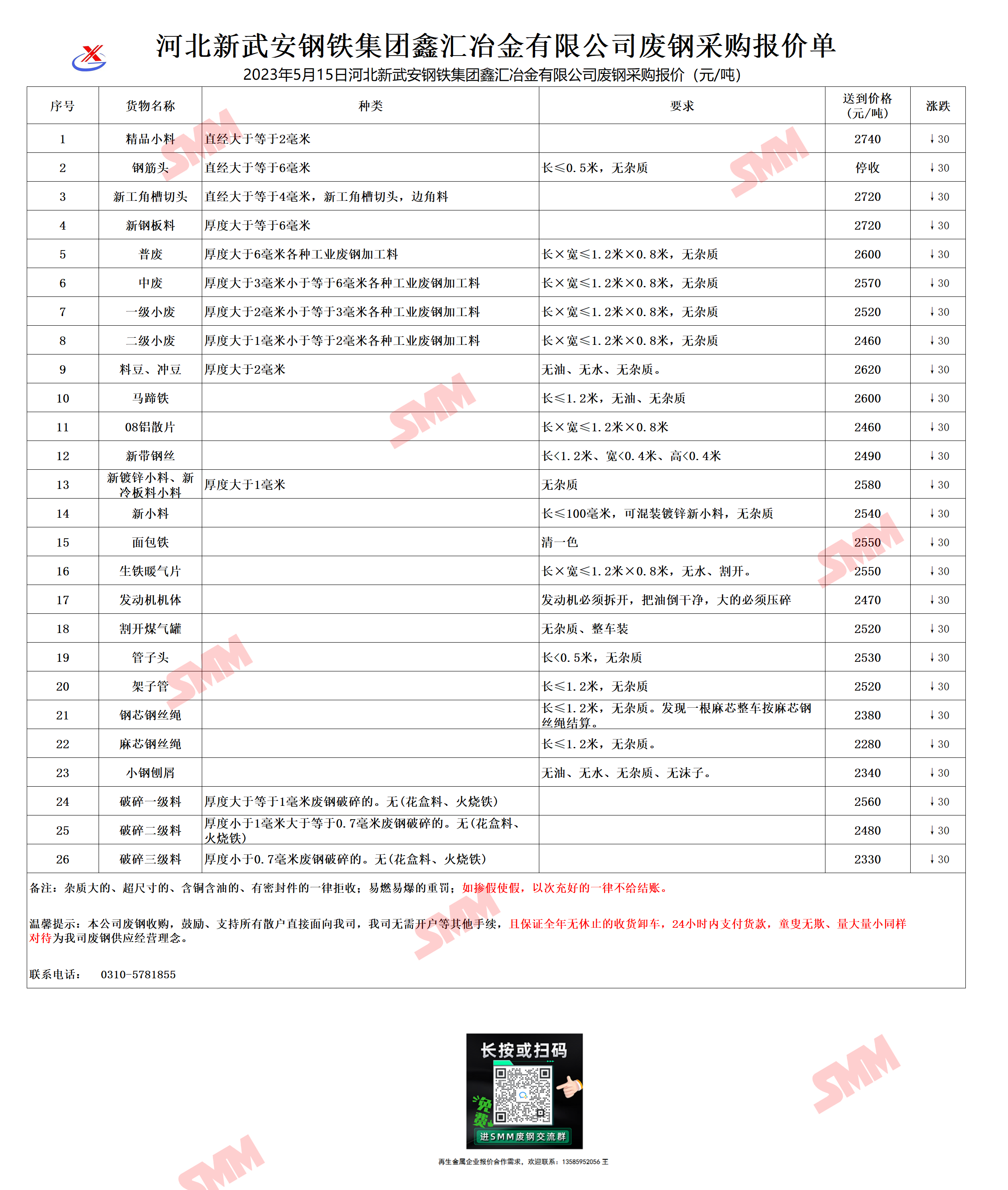 今日河北鑫汇冶金 废钢采购报价已更新,有货的朋友欢迎联系我们!