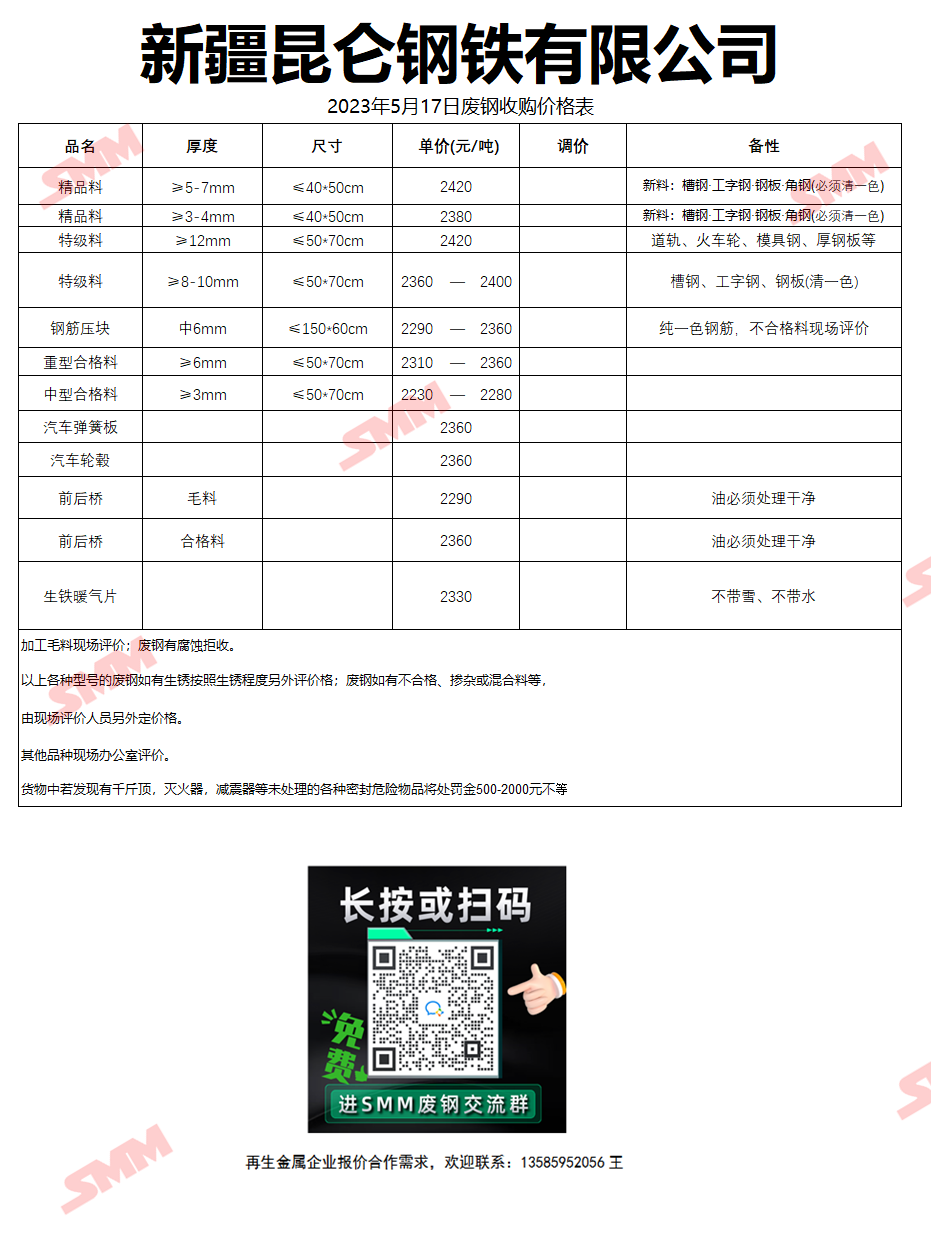 5月17日新疆昆仑钢铁 废钢收购报价