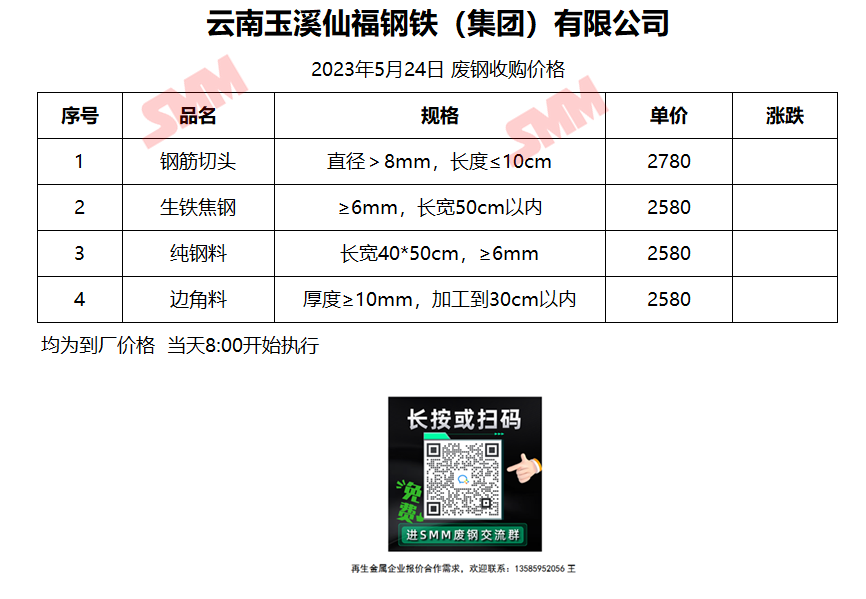 5月24日仙福钢铁 废钢收购报价
