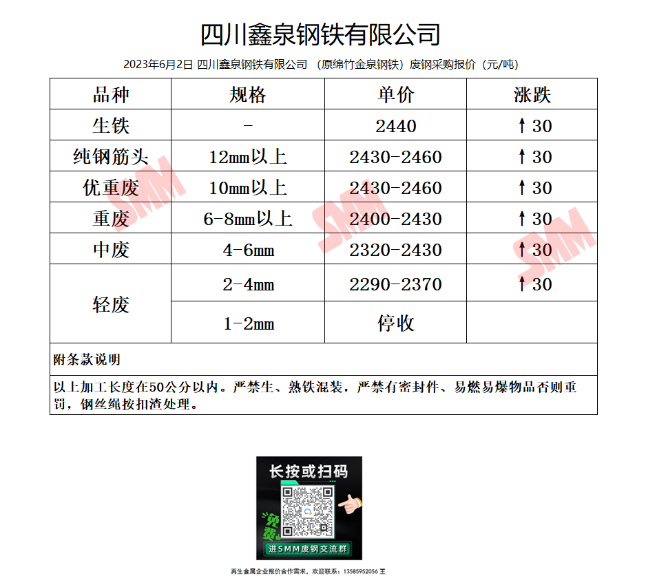 6月2日鑫泉钢铁(原绵竹金泉钢铁) 废钢采购报价
