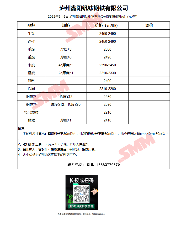 6月6日泸州鑫阳钒钛 废钢采购报价