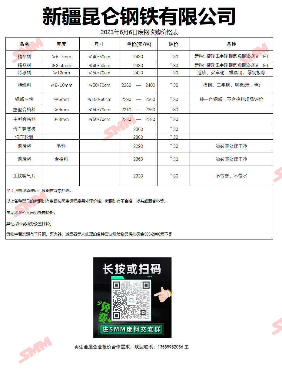 6月6日(14时00分)新疆昆仑钢铁 废钢收购报价