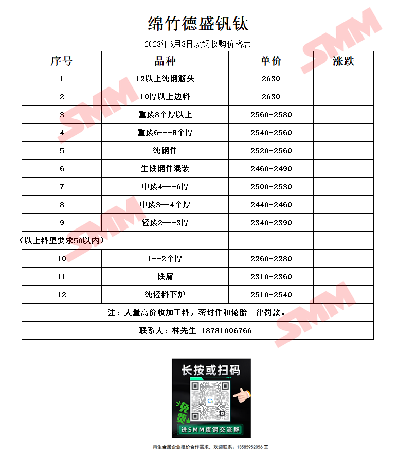 6月8日绵竹德盛钒钛 废钢收购报价