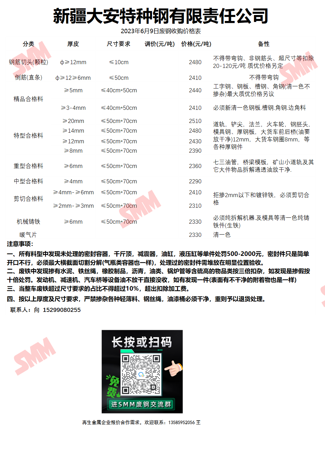 今日新疆大安钢铁 废钢收购报价已更新,有货的朋友欢迎联系我们!
