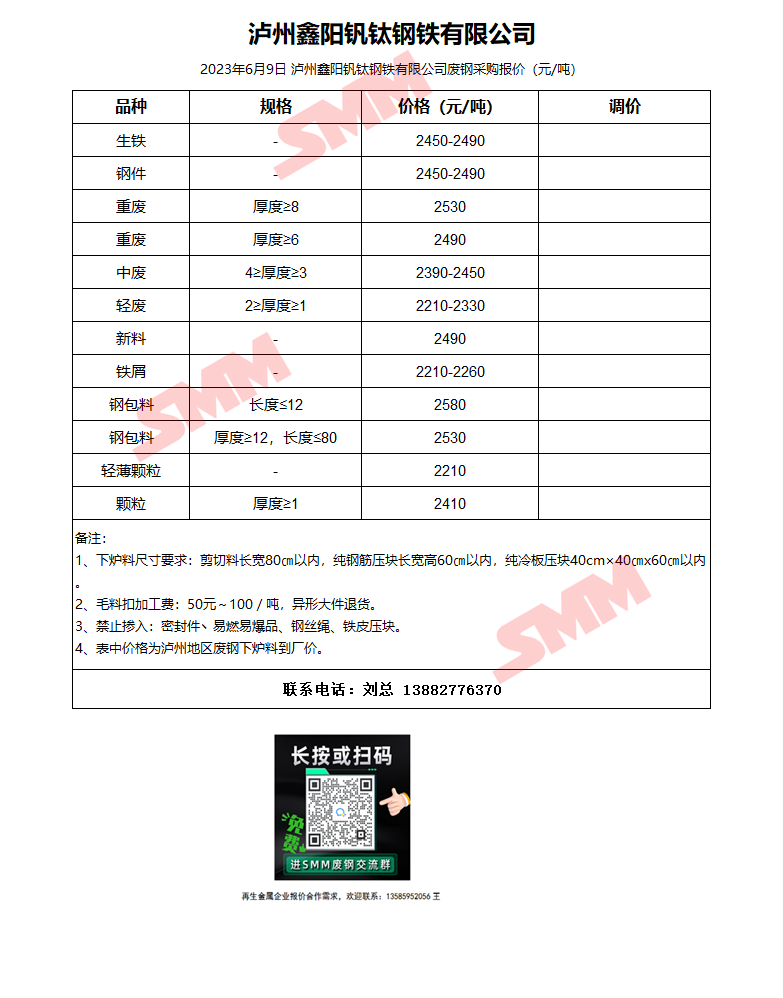 6月9日泸州鑫阳钒钛 废钢采购报价
