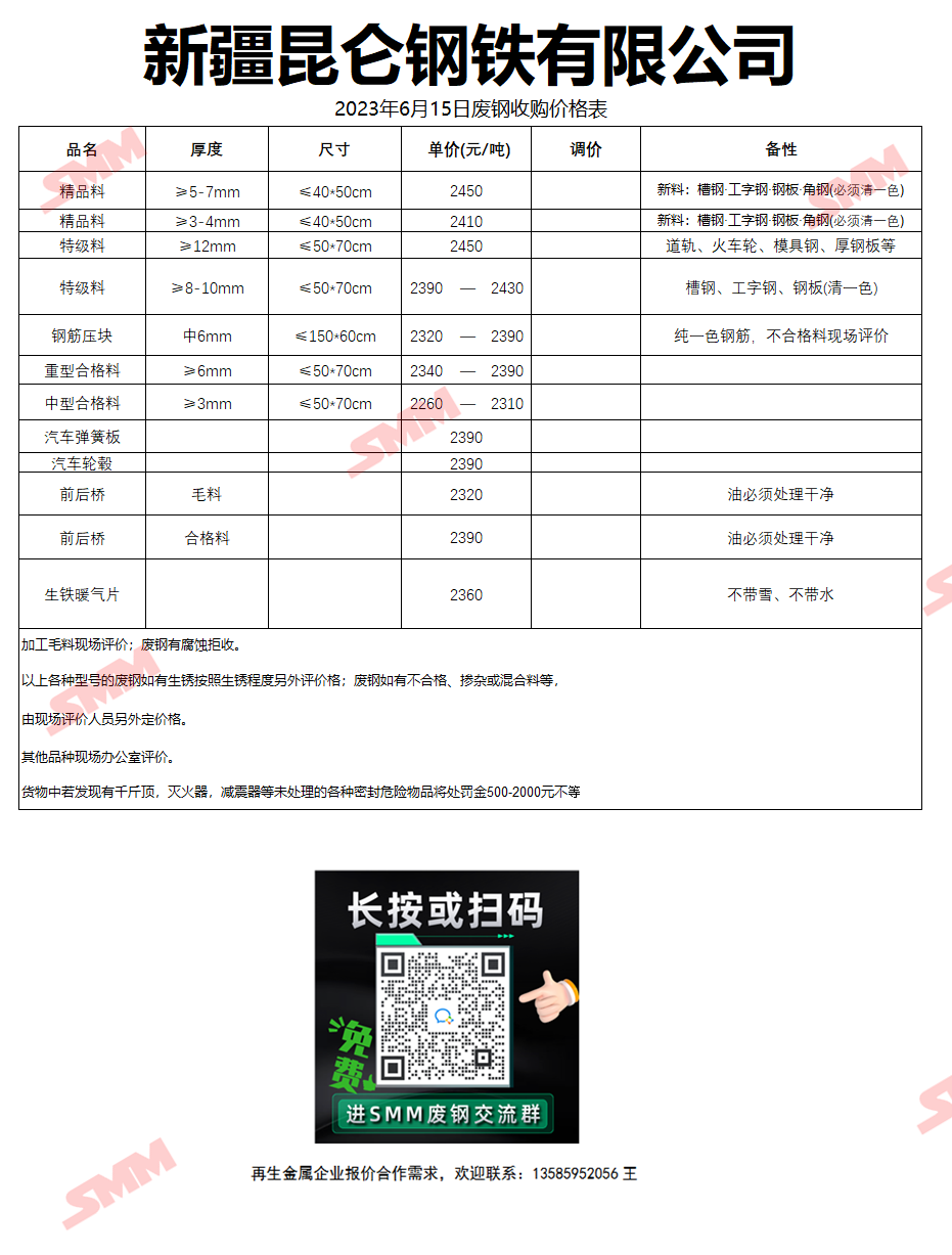 6月15日新疆昆仑钢铁 废钢收购报价