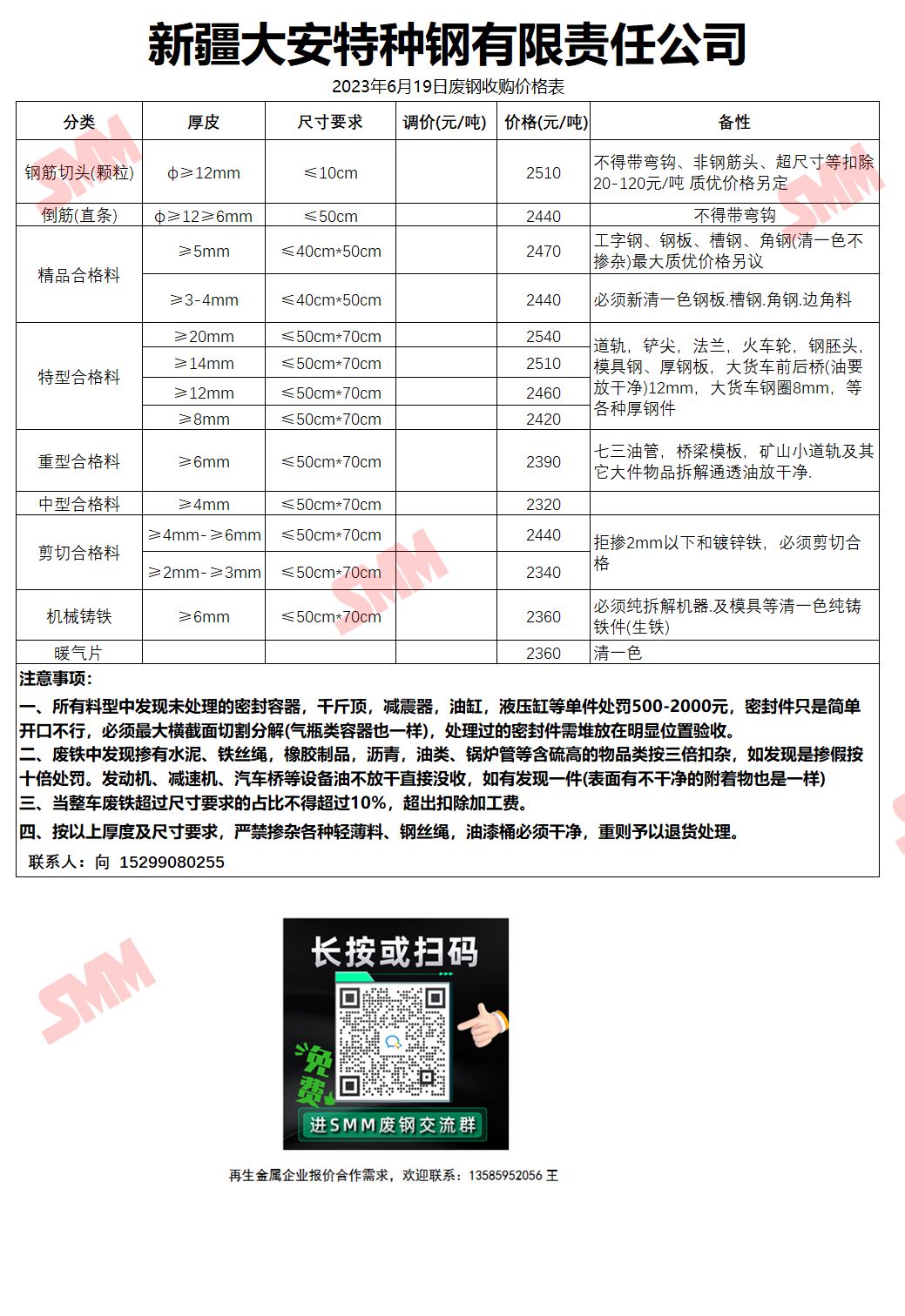 今日新疆大安钢铁 废钢收购报价已更新,有货的朋友欢迎联系我们!