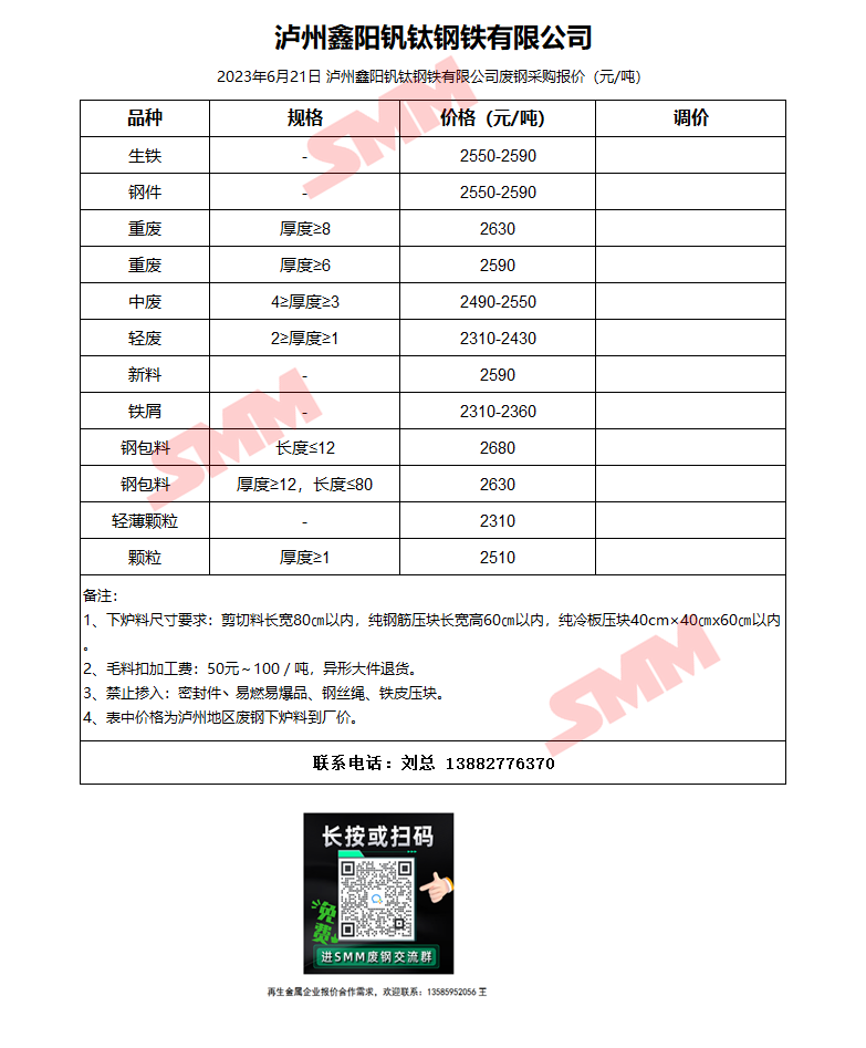 6月21日泸州鑫阳钒钛 废钢采购报价