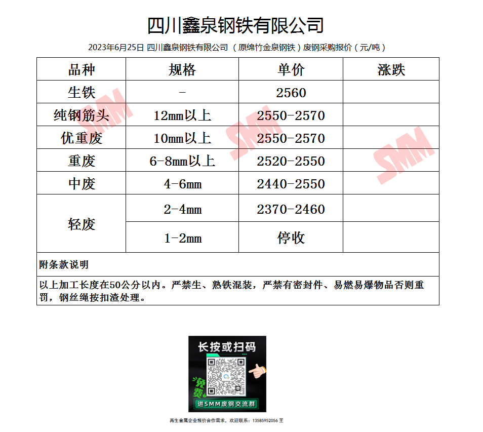 6月25日鑫泉钢铁(原绵竹金泉钢铁) 废钢采购报价
