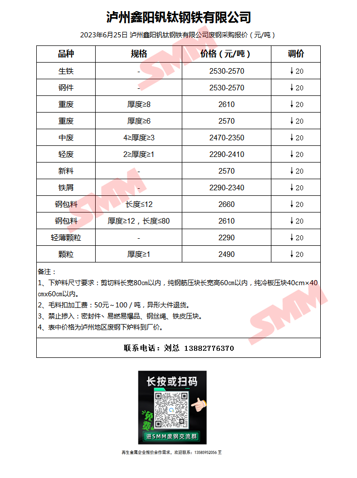 6月25日泸州鑫阳钒钛 废钢采购报价