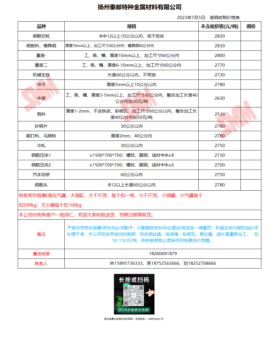 今日秦邮特钢 废钢收购报价已更新,有货的朋友欢迎联系我们!