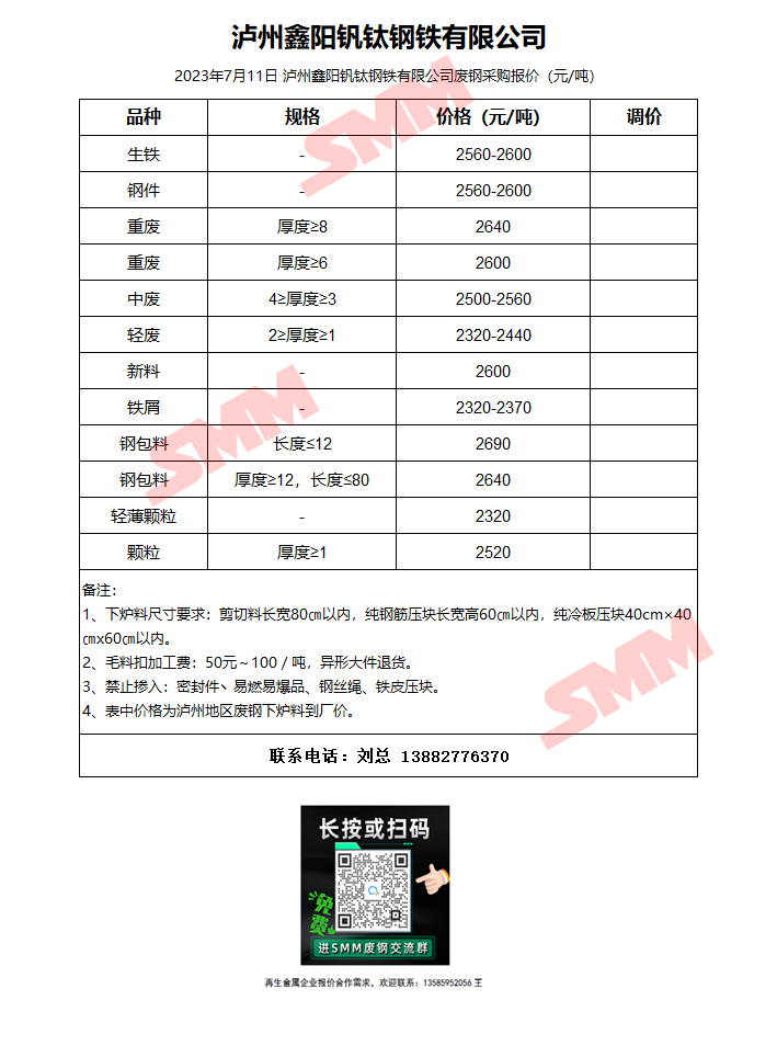 7月11日泸州鑫阳钒钛 废钢采购报价