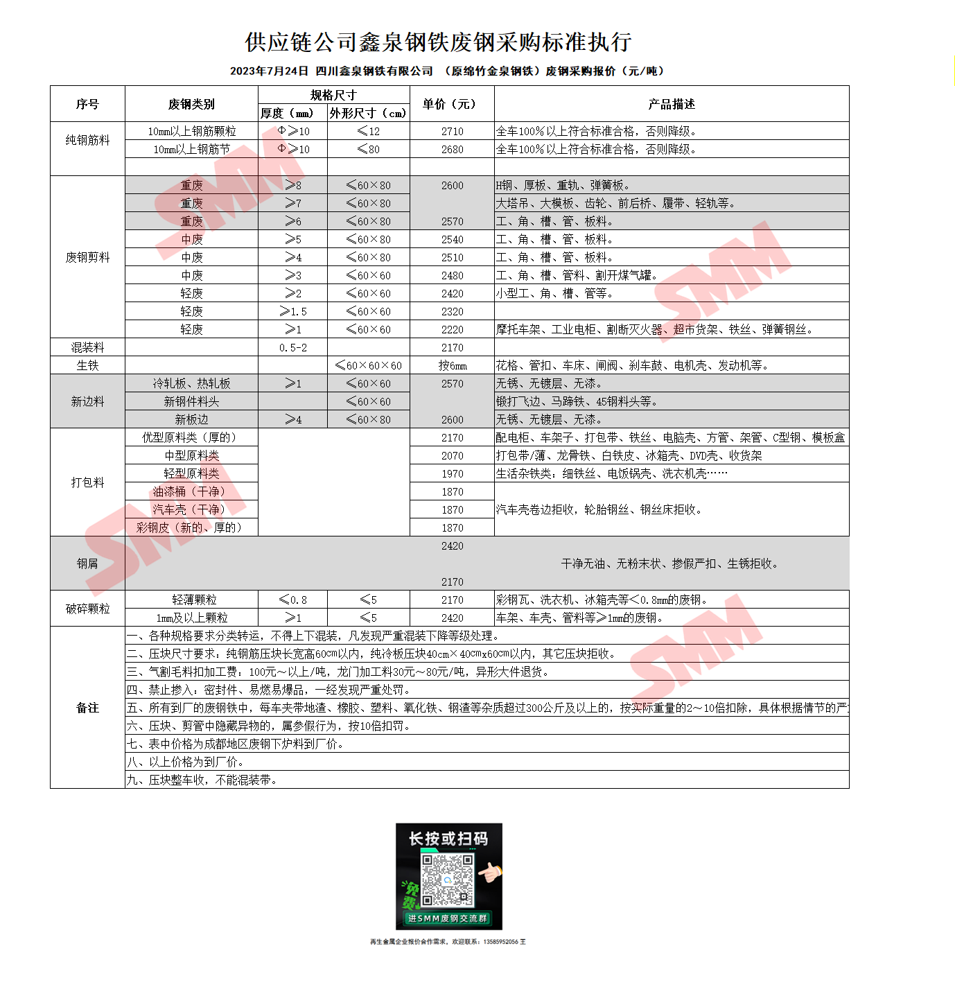 7月24日鑫泉钢铁(原绵竹金泉钢铁) 废钢采购报价