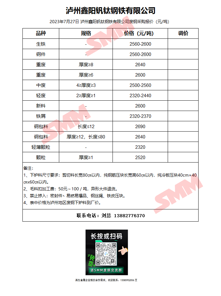 7月27日泸州鑫阳钒钛 废钢采购报价