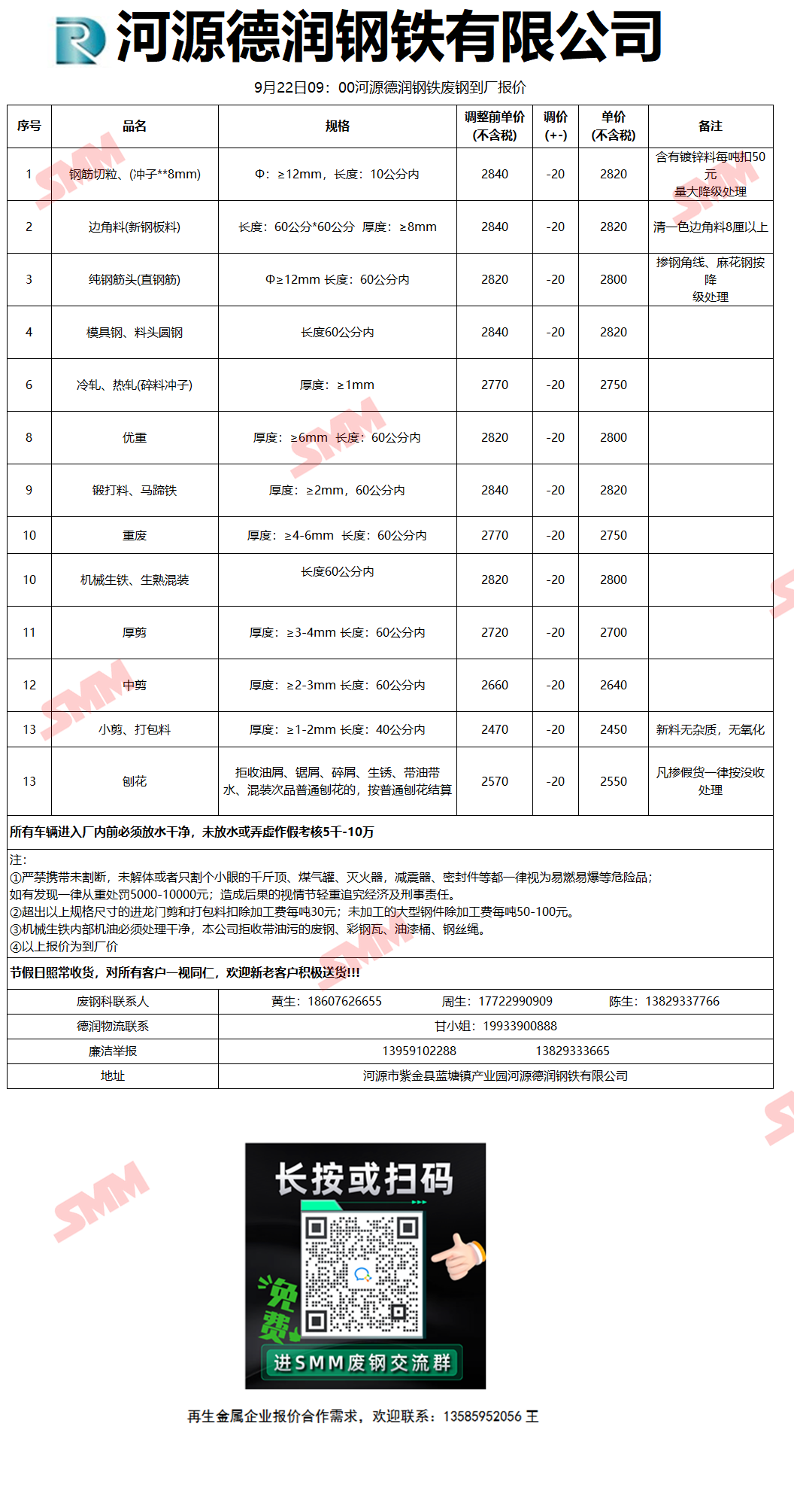 今日(10时30分)河源德润 废钢收购报价已更新,有货的朋友欢迎联系我们!