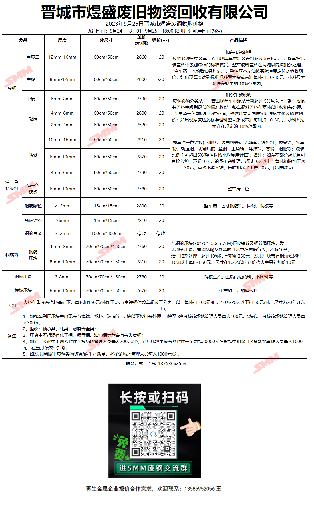 今日晋城市煜盛 废钢收购报价已更新,有货的朋友欢迎联系我们!